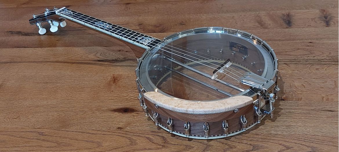 The Deluxe resonator version is concave in shape and made from maple laminate and burl walnut veneers. The tone produced by a banjo with a concave resonator is generally warmer and less bright, making it well-suited for folk, traditional, and more intimate acoustic settings.