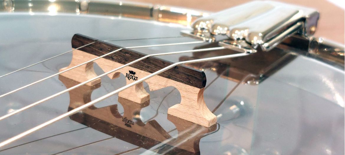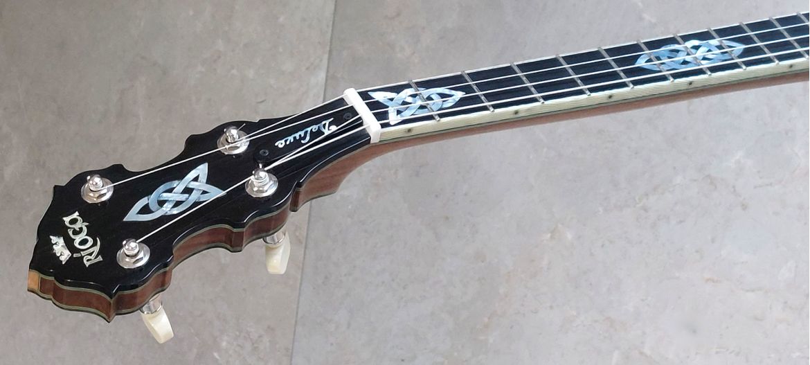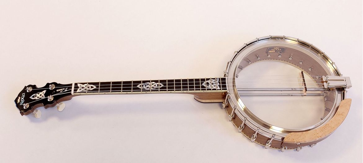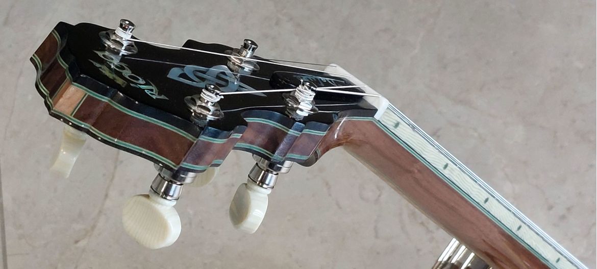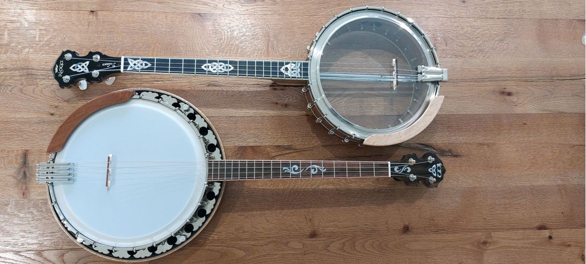 The Rioga Deluxe is our highest professional level tenor banjo. The sound is perfectly balanced with an overall tone, good sustain and volume. It is so easy to play, set up brilliantly with low buzz free action. The arm rest and neck in particular are quite unique in design with great innovative touches in both feel/function and also aesthetics. We are now introducing the Rioga Supreme which will have a cast flange and concaved burl walnut resonator and fine wood marquetry edging