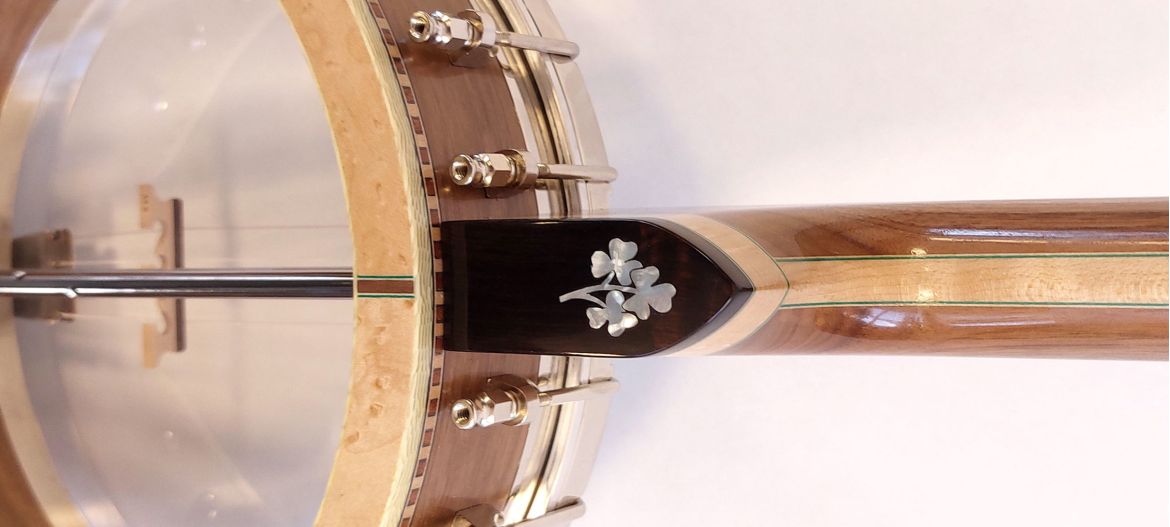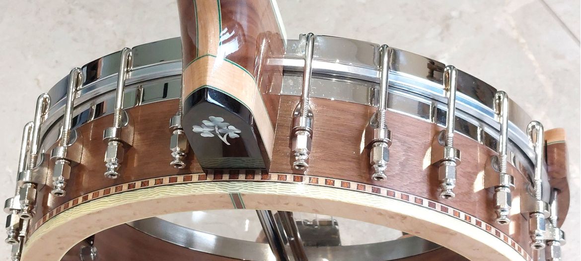Our block rims are constructed from Irish sycamore which are built in three tiers and covered in veneers to match the neck wood. The banjo rim is such an important factor in the tone and resonance of a banjo which is mostly overlooked. Our rims are highly decorated with wood marquetry and ivoroid binding along the inner and outer edges. Our rims are then covered in a matching walnut veneer which are thicknessed from the same wood as the neck to maintain the same colour and grain match.
