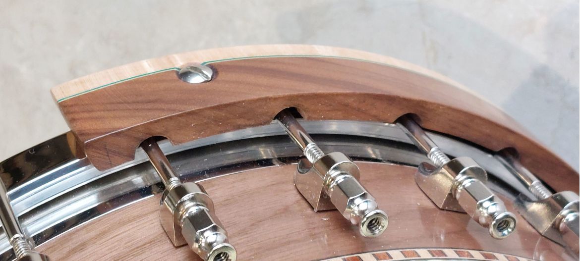 We use the off cut of our 7 piece neck to create a cohesive match to the neck. We believe the wooden armrest offers better comfort and an attractive appearance. The armrest is attached to the tension hoop via a brass ferrule insert & 3 screws which is tapped into the hoop, this is a solid attachment. Some banjo players can have nickel allergies and cannot use nickel plated armrests, so this is a perfect solution!