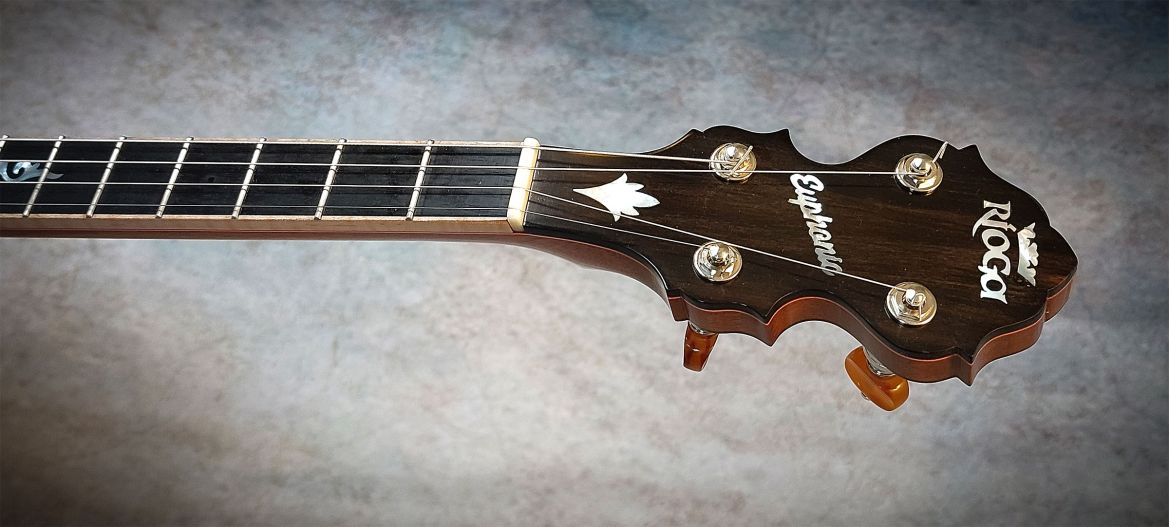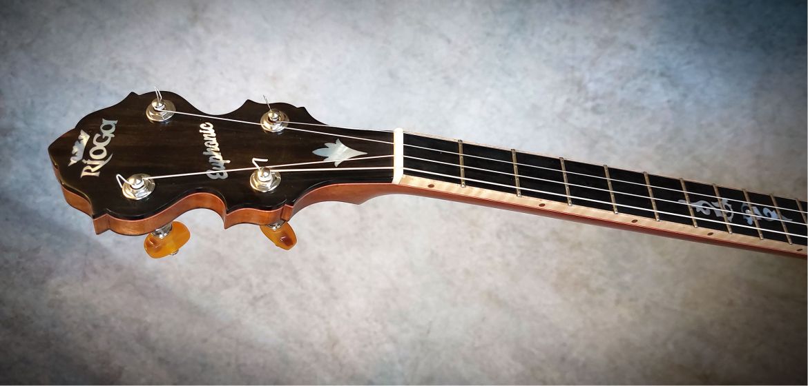 We try to keep the mother of pearl inlay to a minimal and therefore adding a small decoration to the headstock including the Rioga Logo and Euphonic name. We also inlay the middle of the banjo neck with a floral design.
