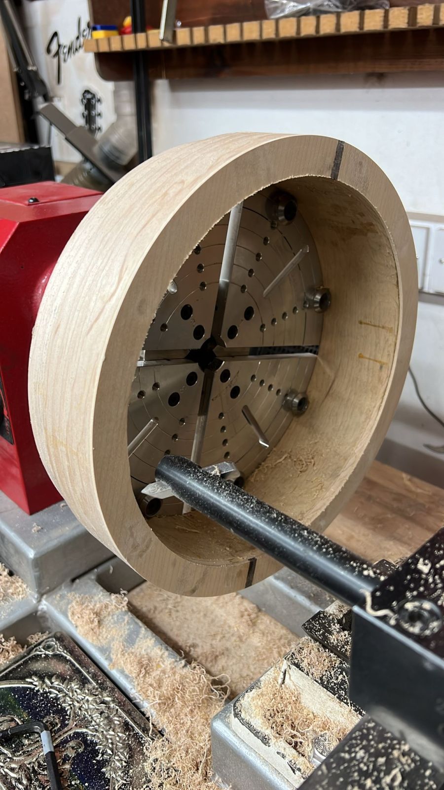 - Solid block sycamore rim with mahogany veneer and fancy wood marquetry around the inner and outer edges.